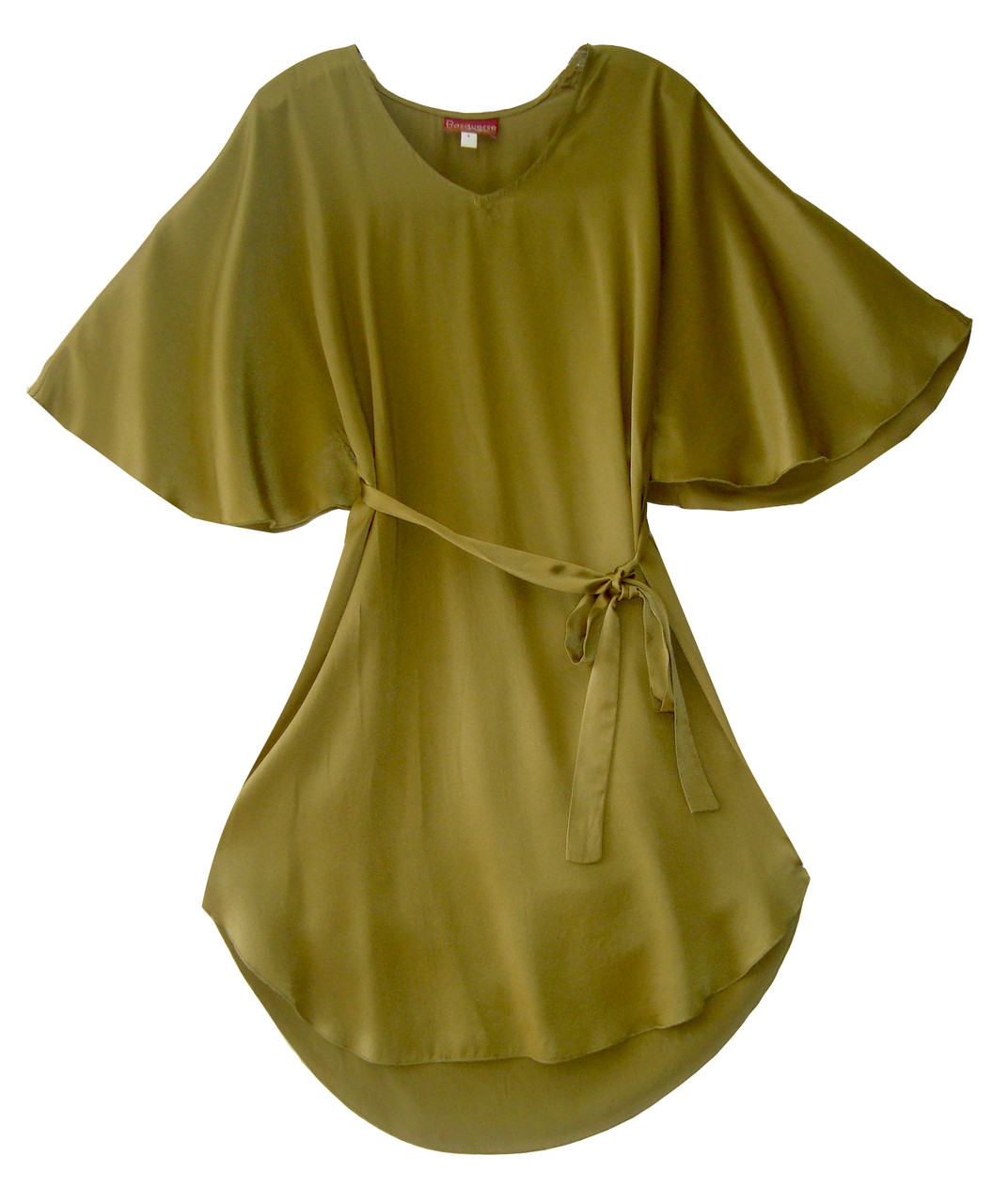 Tunic style dress with circle bodce and sash. Length to the knee and babylock edge finish. 100% silk.